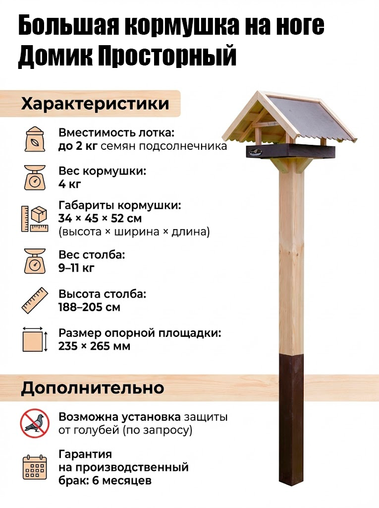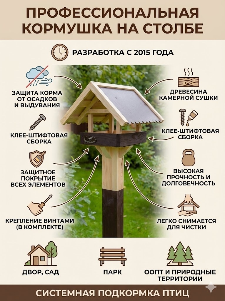 Кормушка на столбе для системной профессиональной подкормки птиц. Подходит для установки во дворе, саду, парке, на ООПТ и других природных территориях.